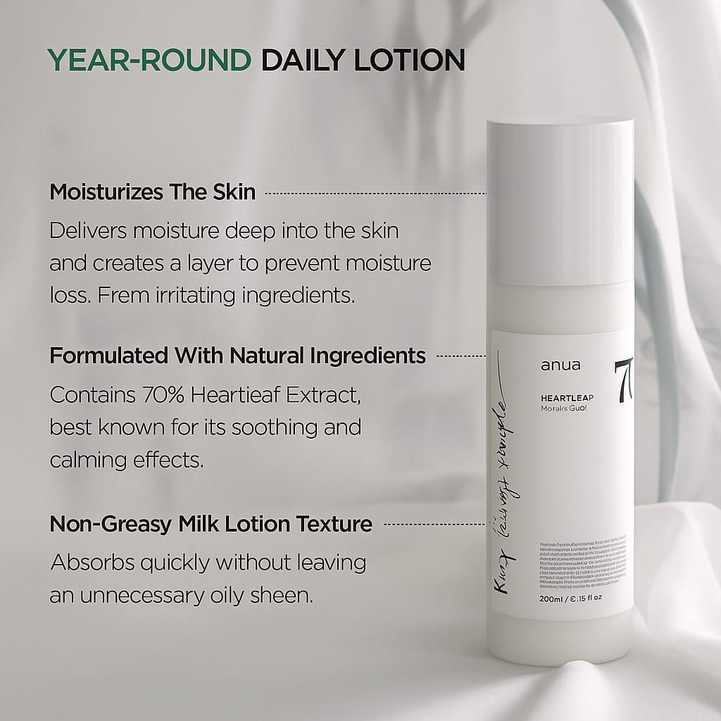 Anua Heartleaf Daily Lotion is a lightweight, non-greasy moisturizer designed for everyday use.